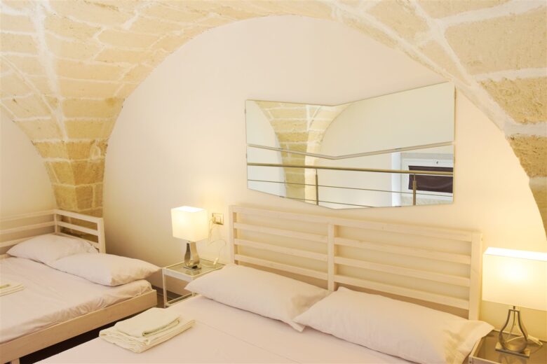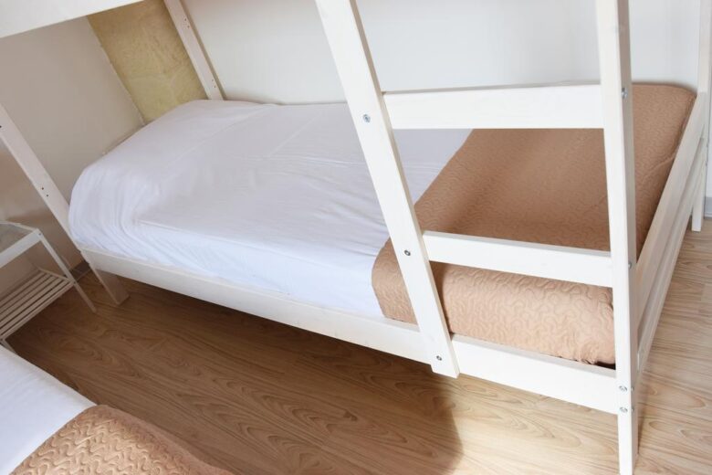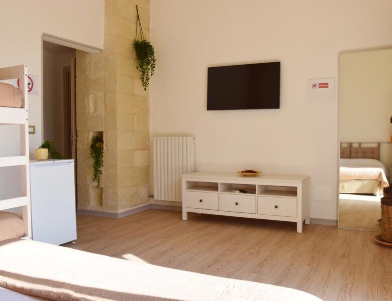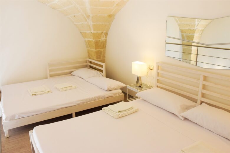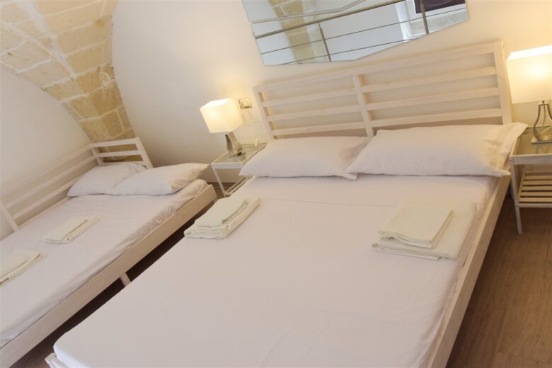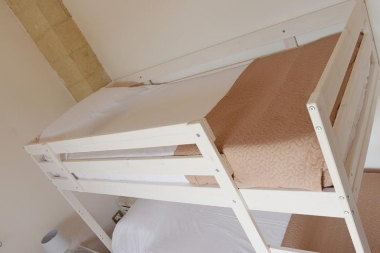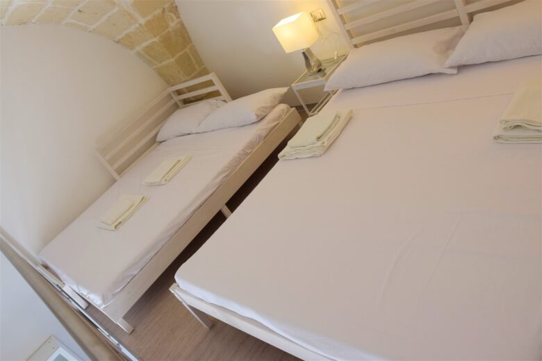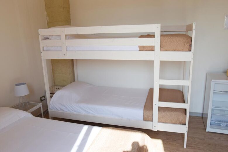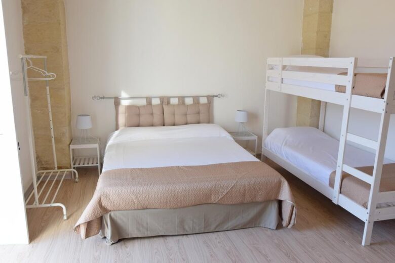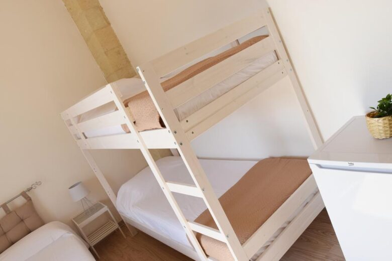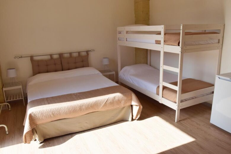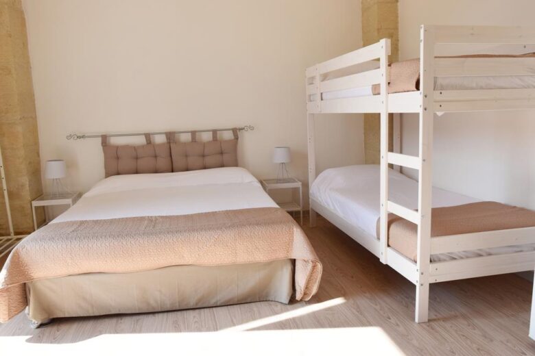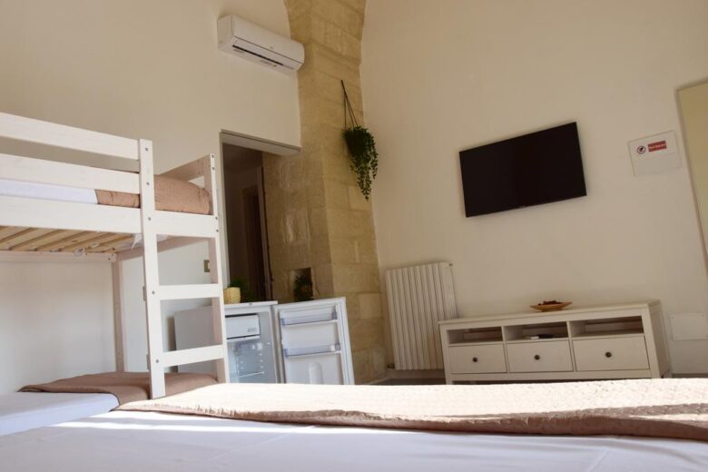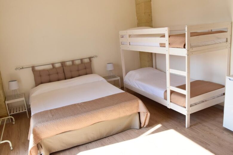 Camera climatizzata per quattro ospiti con letto matrimoniale, letto a castello e bagno privato